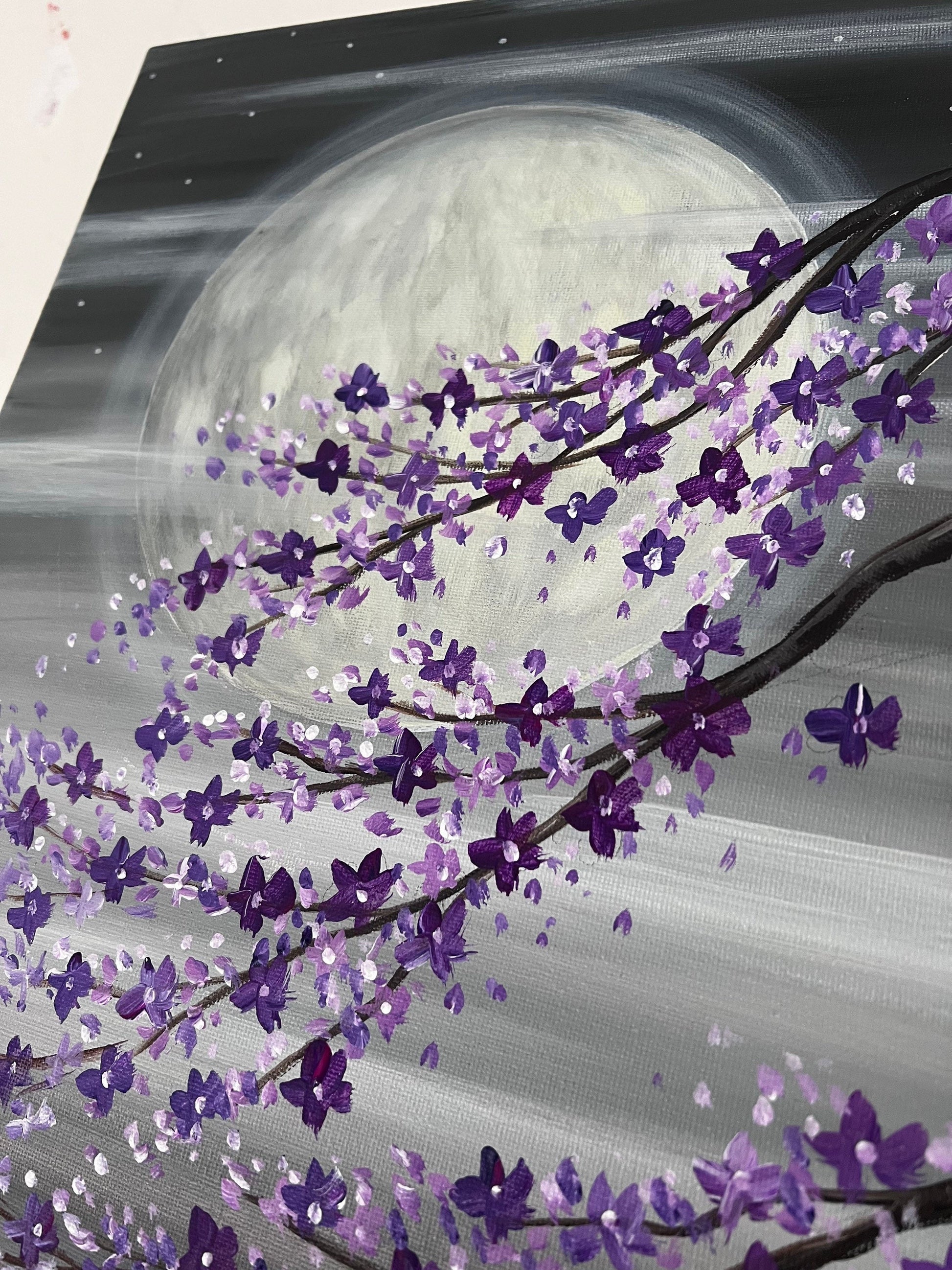 Japanese Cherry blossom artwork. Full Spring moon behind flowers.